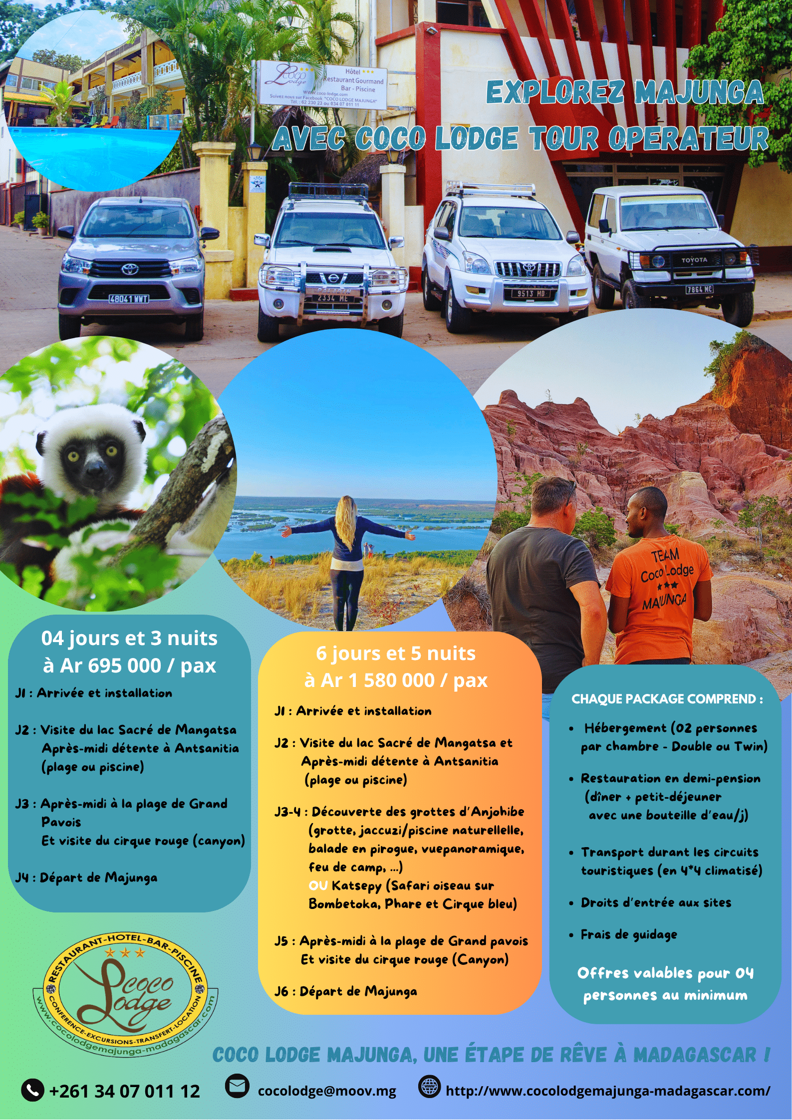 Per scoprire pienamente le meraviglie di Majunga e dei suoi dintorni, Coco Lodge Majunga ti supporta con un'offerta completa di circuiti organizzati. In quanto Torre dell'operatore approvato (Licenza B), Coco Lodge ti offre escursioni su misura guida, autista, e servizi personalizzati.